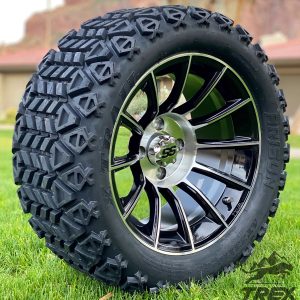 Fits any golf cart. Order with confidence! This wheel and tire kit stands in at 18.0″ tall (from ground to top of tire) and DOES NOT REQUIRE A LIFT KIT. Same height as your stock golf cart tires, so you will not experience any rubbing with this wheel set on a stock golf cart suspension.